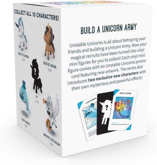 Your favorite Unstable Unicorns characters have been turned into vinyl mini figures! Each blind box contains a surprise character and an Unstable Unicorns promo card featuring new artwork. Find 8 characters you know and love and 2 brand new mystery characters! Collect them one by one, or get the pack of 18 and you’re guaranteed to find all 10 figures!